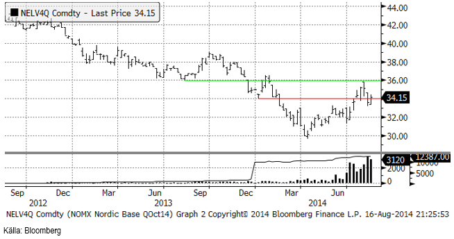 Terminskontraktet för det fjärde kvartalet befinner sig sedan ett par veckor i rekyl nedåt. Tekniskt stöd finns vid 33 och motstånd vid 36 euro per MWh. Den medellångsiktiga trenden är uppåtriktad och vi tror att man hellre ska köpa än sälja. Vi fortsätter alltså med köprekommendation.