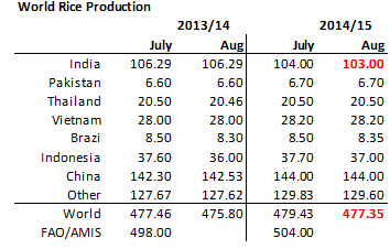 USDA justerade ner produktionsestimatet för Indiens risproduktion med 1 mt till 103 mt för 2014/14. Det är monsunskörden som sänkts eftersom det regnat mindre än normalt. På global basis sjunker produktionen av ris med drygt 2 mt.