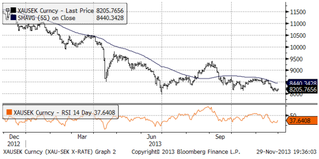 I termer av kronor, har priset hållit sig stabilt, med endast marginella prisrörelser under veckan. Vi ser kursdiagrammet på priset i kronor för ett troy uns nedan. Notera att vi inte har någon teknisk köpsignal, men vi har ett tekniskt stöd vid 8000 kr. Trenden är fortfarande nedåtriktad.