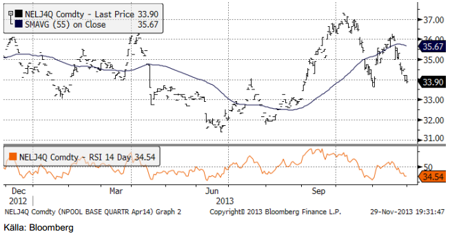 Certifikatet byter nu kontrakt från vinterkontraktet kvartal 1 till vår/försommarkontraktet kvartal 2. I diagrammet nedan ser vi den historiska prisutvecklingen på kvartal 1-kontraktet. Priset har rekylerat ner på förbättrad hydrologisk balans.