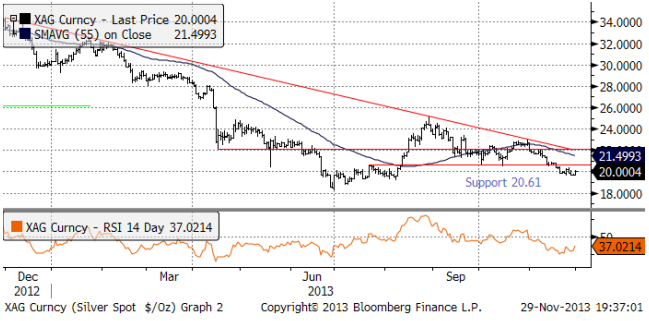 Nedan ser vi kursdiagrammet för silver i dollar per troy ounce. Priset stängde i fredags på 20 dollar per uns. Silverpriset har haft svårt att ta sig bort från 20 dollar. Vi hade förväntat oss något svagare utveckling efter att priset gick under 20 dollar första gången för en dryg vecka sedan.