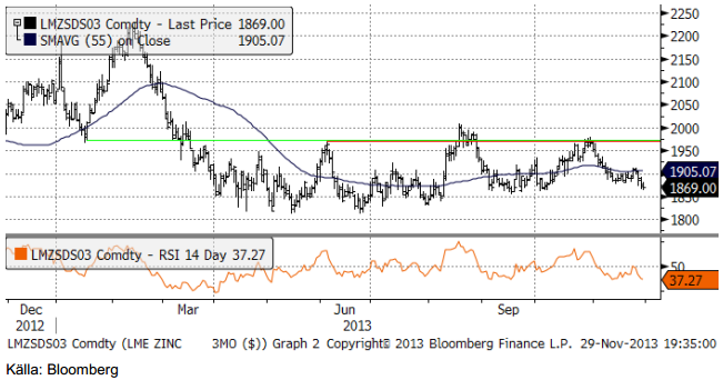 Zinkmarknaden handlar ner mot 1850-nivån, där det bör finnas stöd. Det är i botten av det konsolideringsintervall som varit rådande sedan april i våras. Vi rekommenderar köp av ZINK S.