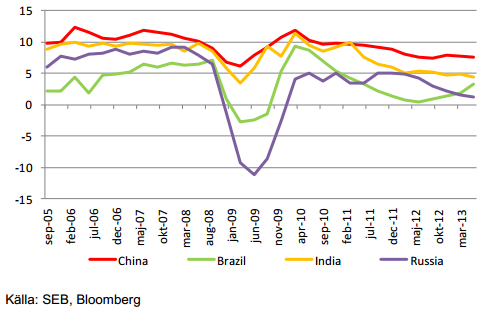 Nedan ser vi BNP-tillväxten i de fyra BRIC-länderna. Det kan vara svårt att tro, men Brasilien är faktiskt det enda BRIC-landet som ökat sin tillväxt de senaste kvartalen och har nu en högre tillväxt än Ryssland. Vi ser att Indiens tillväxt är den som minskat mest de senaste två åren. Kinas tillväxt är också i sjunkande trend.