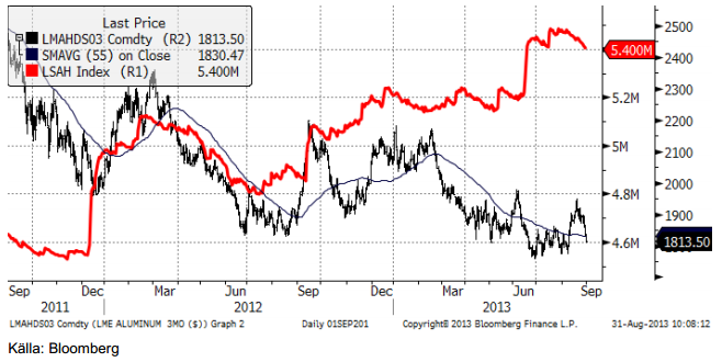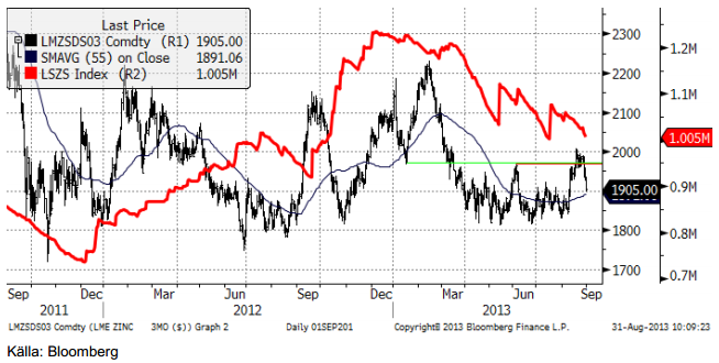 Sedan kursfallet under det första kvartalet, har zinkpriset fastnat i ett relativt smalt prisintervall mellan 1800 och 1950 dollar per ton. Uppgången sedan juli, som tillfälligt bröt 2000-nivån, ser ut att vara slutet på ”sidledeshandeln”. Efter flera år när det producerats mer än vad som konsumerats, har marknaden börjat komma i balans igen. Lagernivåerna vid LME har också börjat sjunka och uppgår nu till 1 miljon ton, vilket är enormt mycket, men drygt 200,000 ton mindre än för ett halvår sedan. Enligt ILZG var låg marknaden på ett överskott om 44,000 ton under det första halvåret, jämfört med 157,000 ton samma period förra året. Det långsiktiga ”bull-caset” för zink är baserat på att betydande gruvkapacitet stängs de kommande åren. Detta gäller fortfarande. 1.5 mt årlig produktionskapacitet väntas bli nedlagt under åren 2013 till 2016. Av detta tängs 450,000 tons kapacitet det kommande året.