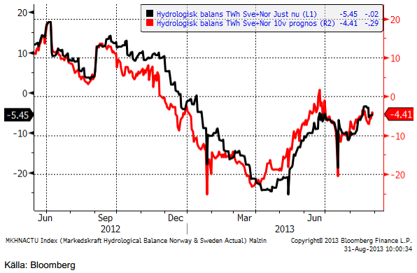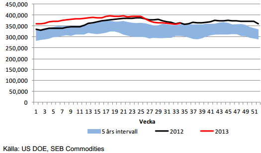 Råoljelagren i USA, ligger efter den starka importsiffran, på samma nivå som förra året. Till viss del kan detta ha sin orsak i oroligheterna i USA visavi Syrien, men det är också säsongsmässigt så att lagren vänder upp vid den här tiden på året inför höst och vinter.