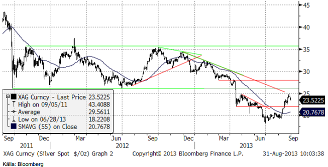 Guldpriset har rekylerat upp och nått upp till nivåer där rekylen torde stöta på motstånd i det korta perspektivet. USA:s president Obamas tal om Syrienkonflikten, längre beskriven under råoljeavsnittet ovan, torde få en klart negativ påverkan på guld- och silvermarknaderna i den kommande veckan.