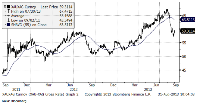 Nedan ser vi kvoten mellan guldpriset och silverpriset. Silver har hämtat igen en del mark mot guldet sedan slutet av juli. Kanske är det dags att tappa lite mot guldet nu.