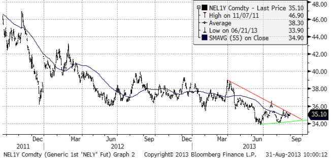 Nedan ser vi prisdiagrammet på det första kvartalets 2014 kontrakt. Vad vi ser är successivt lägre toppar sedan mars månad, och successivt högre bottnar sedan juni. Detta bildar en inom den tekniska analysen, klassiskt så kallad ”triangelformation”. Man ser dem ofta vid trendvändningar. I det här fallet är den huvudsakliga trenden nedåtriktad. Man bör alltid vänta på utbrott från triangeln, men med tanke på dels att priset är riktigt lågt i ett historiskt perspektiv och att det varit en varm och regnfattig sommar, med underskott i vattenmagasinen, ett år äldre kärnkraftverk, så skulle det inte förvåna om priset steg.