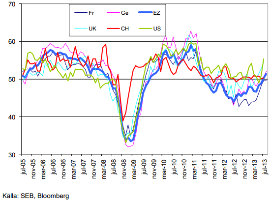 Nedan ser vi utvecklingen för PMI, en ledande konjunkturindikator, för några av världens viktigaste ekonomier. Notera hur det fortsätter att förbättra sig i Eurozonen och i USA, medan råvarulokomotivet Kina ligger fast vid 50, som indikerar varken tillväxt eller kontraktion.