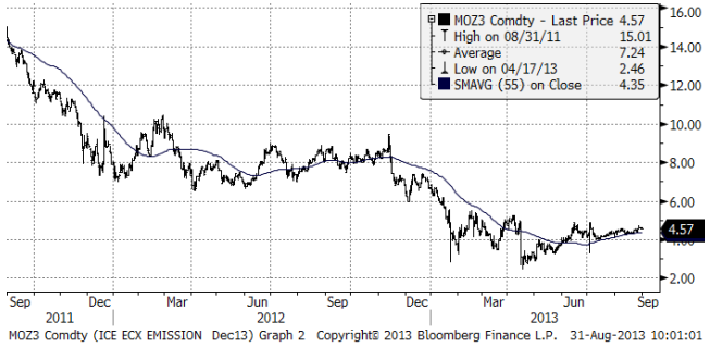 Marginalkostnaden för att producera el bestäms av priset på kol och priset på utsläppsrätter. Nedan ser vi priset på utsläppsrätter i euro / ton. Vi ser att priset bottnade i april. Sedan dess har en viss återhämtning och framförallt konsolidering ägt rum.