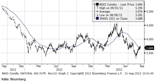 Naturgaspriset har varit fallande sedan maj, men har rekylerat upp i augusti. Vi tror att det handlar om just en rekyl och att priset kommer att vända ner igen.