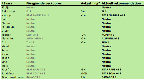 *) Avkastningen lämnar vi blank här eftersom det har varit ett två månaders uppehåll. Generellt sett har dock rekommendationerna varit lyckosamma med kraftiga nedgångar i priset på t ex spannmål och oljeväxter och prisuppgång på basmetaller.