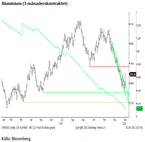 Före årsskiftet diskuterade vi kollapsen i oljepriset och dess påverkan på hela energiområdet som skapar ett negativt sentiment till råvaror. Trots att kinesiska producenter av aluminium är huvudsakligen beroende av kol spelar olja sin roll som del av energiekvationen. Som konsekvens finns det en oro för att i synnerhet kinesiska producenter kommer att öka produktionsnivån på grund av den lägre kostnaden, vilket kan leda till ökad export av aluminiumprodukter. Det fallande oljepriset i kombination med den starkare dollarn har varit de huvudsakliga faktorerna som har pressat priserna sedan december. I veckan började vi se ett starkare stöd komma in i aluminiummarknaden med en 1 procents uppgång. Detta kom samtidigt som oljepriset stabiliserades, och värt att nämna, trots att dollarn fortsatte att stärkas. Så vad händer härifrån? Från ett kostnadsperspektiv anser vi att nedsidan är begränsad. Tekniskt såg vi en trendvändning i fredags med en stark stängning rund 1845 dollar. Kortsiktigt ligger nästa motståndsnivå vid 1880-1900 dollar, vilket i det nuvarande negativa sentimentet kan visa sig svårt att bryta igenom. Dock ligger en trendvändning mot högre nivåer i korten de kommande veckorna.