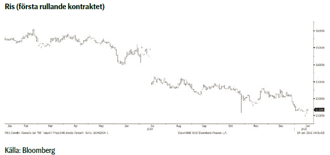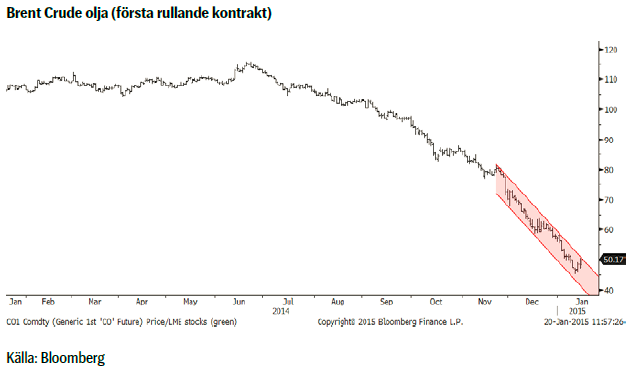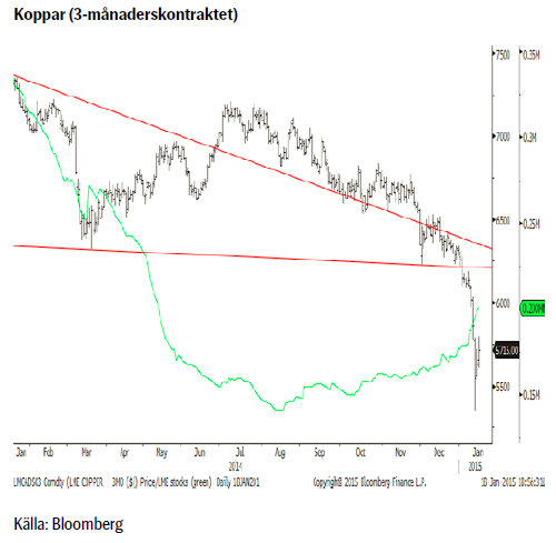 Fallande oljepriser och en stärkt dollar var huvudteman för slutet av förra året vilket gav ett negativt sentiment inför det nya året. Oljan fortsatte ned med 12 procent. Bland metallerna ser vi den mest beaktansvärda prisförändringen hos koppar. Vid öppningen i Kina i onsdags föll metallen 5 procent på 30 minuter. Stora stop loss ordrar kunde observeras i en relativt tunn marknad.