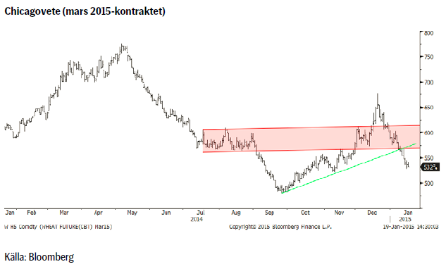 Chicago vetet (mars15) steg initialt i början på veckan men har sedan dess fallit tillbaka och avslutade veckan på 532,75 US cent. En negativ WASDE-rapport samt en förbättrad vädersituation för det amerikanska höstvetet i kombination med en starkare dollar fick priserna på fall.