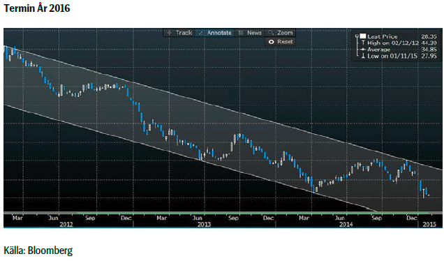 Med anledningen av ovanstående är det svårt att se att nordiska elterminer ska stärkas väsentligt eller långvarigt. Den fallande trend som präglat marknaden under mycket lång tid, se graf nedan (där vi för kontinuitetens skull valt År 2016 terminen), är i högsta grad fortsatt en realitet. Eftersom vi ännu bara är i mitten/slutet av januari så kvarstår risken för vinterkyla och därmed starkare spotpris och att frontterminerna sticker högre, men under rådande situation tror vi att marknaden mer kortvarigt stiger och att man därefter kommer att sälja ned den igen.