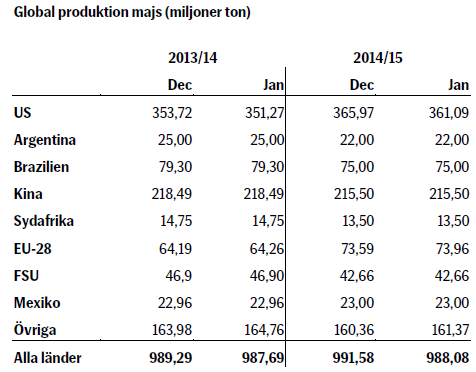 Den globala produktionen av majs justeras ner med 3.5 miljoner ton till 988,08 miljoner ton, framförallt till följd av lägre produktion i USA.