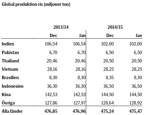 Den globala produktionen av ris justeras upp med 0,23 miljoner ton från förra månaden till 475,47 miljoner ton, vilket dock är något lägre än rekordskörden 2013/14. Revideringen beror framförallt på en ökning i produktionen för Paraguay vilken till viss del väger upp för lägre produktion i Brasilien.