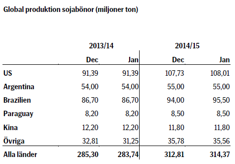 Den globala produktionen av sojabönor justeras upp från 312.81 miljoner ton till 314,37 miljoner ton och markerar ökad produktion i USA och Brasilien. Brasiliens produktion justeras upp med 1,5 miljoner ton till 95,5 miljoner ton och börjar nu närma sig CONABS senaste estimat (95,9 miljoner ton). Argentina lämnades oförändrad på 55 miljoner ton.
