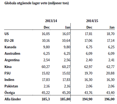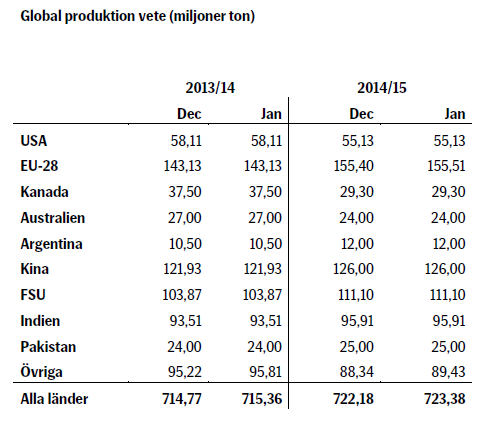 Även den globala exporten av vete justeras upp med 1,2 miljoner ton trots att exporten från Ryssland väntas minska med 2 miljoner ton till följd av de annonserade exportskatter som förväntas träda i kraft från den 1 februari.