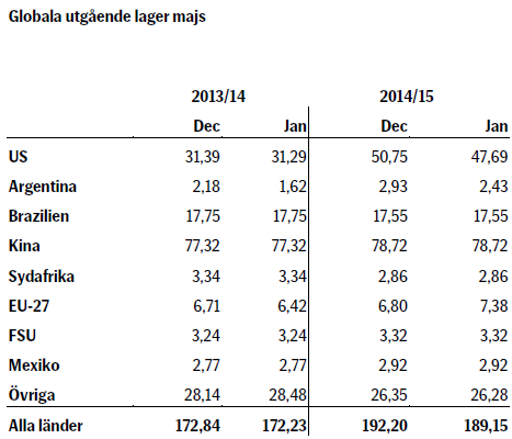 Något överraskande så justerade USDA ner avkastningen i USA från 173,4 bpa till 171,0 bushels per acre samtidigt som produktionen justeras ner från 14,407 miljarder bushels till 14,216 miljarder bushels (fortfarande rekord). Utgående lager justeras ner från förra månadens 1,998 miljarder bushels till 1,877 miljarder bushels.