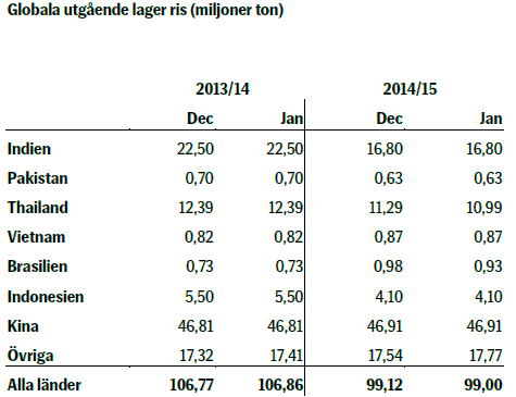Globala utgående lager estimeras till 99,00 miljoner ton, vilket är 0,12 miljoner ton lägre än förra månaden och en minskning med 7,86 miljoner ton från året innan. Enligt USDA minskar lagren i Brasilien och Thailand, medan de ökar i USA och Bangladesh.