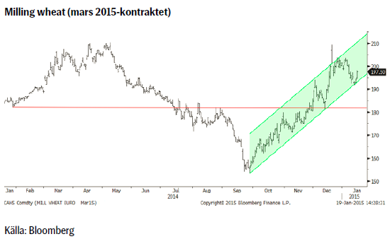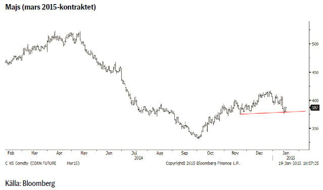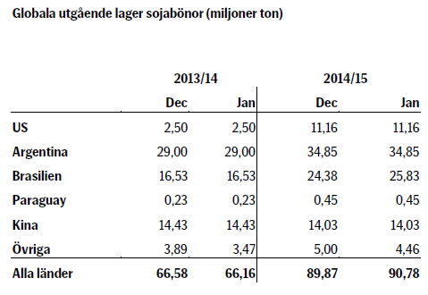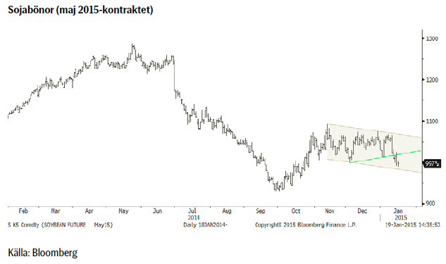 Sojabönor (Mar15) föll kraftigt efter USDA’s publicering av WASDE-rapporten där global produktion och utgående lager justerades upp. Därefter har priset fortsatt ner under veckan men funnit temporärt stöd vid den tekniskt och psykologiskt viktiga 1000 US cent-nivån, Amerikansk statistik under torsdagen fick dock priset att bryta igenom stödet och mars-terminen avslutade veckan på 991 US cent. Gynnsamt väder i Sydamerika inför den stundande skörden liksom förväntningar på att arealen under sojabönor i USA kommer att öka i vår har också fått priserna under press.