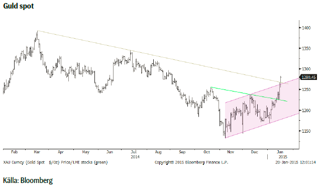 Guldpriset i dollartermer steg förra veckan med 4,7 procent. Den schweiziska centralbankens beslut att släppa schweizerfrancen fri mot euron bidrog till prisuppgången. Beslutet ledde till våldsam volatilitet i finansmarknaderna och många aktörer, däribland IMF, lyfte på ögonbrynen. Den väl rotade uppfattningen att schweizerfrancen är en reservvaluta rubbades och investerare sökte sig till guld som alternativ. Man såg även stora inflöden i börshandlade produkter med guld som underliggande.