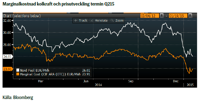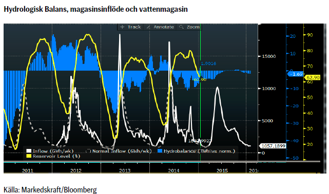 Frånvaron av kalla vinterdagar (låg konsumtion) i kombination med riklig nederbörd och förhållandevis mycket vind har fått elmarknaden att krascha ytterligare. Den hydrologiska balansen (sista grafen), vilken i slutet av förra året var i ett relativt stort underskott, har återhämtats och är nu kring normal. Därutöver har den för den långa prissättningen (terminerna) marginalkostnaden för att producera el med kol och naturgas fallit kraftigt ytterligare. Oljeprisfallet har i mångt och mycket påverkat även priset på kol och andra fossila alternativ och den milda vintern så långt har gjort att lagren står väl fyllda.