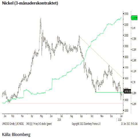 Volatiliteten i nickelmarknaden fortsätter in i det nya året. Det generella negativa sentimentet i råvarumarknaden som är nära ihopkopplat med det fallande oljepriset, stark dollar samt oro för Kina och Europa tog fäste i nickelmarknaden. Nya lägstanivåer noterades redan veckan innan, med en till säljvåg tillsammans med kopparkraschen. 14310 dollar var det lägst handlade priset på onsdagsnatten, en nivå som vi inte har sett sedan januari förra året, precis innan implementeringen av det indonesiska exportförbudet. Nickelpriset vände tvärt upp och stängde på 14770 dollar i fredags, i linje med övriga råvaror. Förutom det generella tumultet finns inte de fundamentala tecknen för den förväntade förbättringen. Det här var då utbudet av malm till de kinesiska Pig Iron producenterna skulle försvinna, delvis på grund regnsäsongen i Filippinerna och bristen på material. Det verkar finnas mer material än vad som tidigare har förväntats. Som vi har nämnt tidigare har LME-lagren ännu inte visat några tecken på minskning. Det positiva utbudscaset håller fortfarande i vår vy, dock minskar risken för kraftiga pristoppar med tiden. SEB har därför kraftigt sänkt prognosen för 2015 (se tabell ovan).