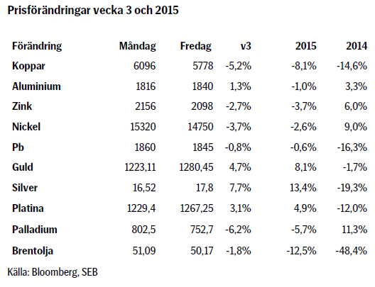 Den svaga starten på det här året öppnar upp för nya möjligheter. Det lägre oljepriset ger en stark injektion till de nettokonsumerande delarna av världen vilket förväntas materialiseras med en 6-9 månaders fördröjning. Förväntade kvantitativa lättnader (QE) i eurozonen kommer stimulera efterfrågan av metaller i Europa. Efterfrågan i USA är redan stark. Den kinesiska ekonomin är fortfarande ett orosmoln, vilket som vanligt kan överraska åt båda hållen. Den svagare byggsektorn är förstås ett stort hot. Dock finns indikationer på omstart av projekt för utbyggnaden av det kinesiska elnätet, vilket talar för ökad användning av koppar och aluminium, vilket skulle kunna vara en kompenserande faktor tillsammans med potentiellt fortsatt hög bilproduktion.
