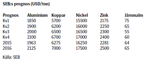 SEB och de flesta andra banker har sänkt sina prognoser för metaller (se nedan). Den extrema förändringen i oljepriset och det faktum att de flesta analytiker förutspår ett lägre pris för en längre tid framöver är en orsak till nedrevideringarna, då energipriser är en del av kostnadsstrukturen för metallproducenter. Även om oljeprisets betydelse i nedrevideringarna kan diskuteras är det tydligt att det spelar roll (notera att SEB prognosticerar ett högre oljepris under andra halvan av 2015, följt av flera år med ett pris i häraden 60-70 dollar per fat. Andra orsaker till lägre prognoser är att Världsbanken och IMF har nedgraderat tillväxtprognosen för världen samt dollarstyrkan som förväntas fortsätta under året. Vad gäller nickel har de flesta analytiker (inklusive SEB:s) i viss mån missbedömt utbudssituationen i Indonesien/Filippinerna, vilket har orsakat en kraftig nedrevidering av nickelprognoserna för de kommande åren.
