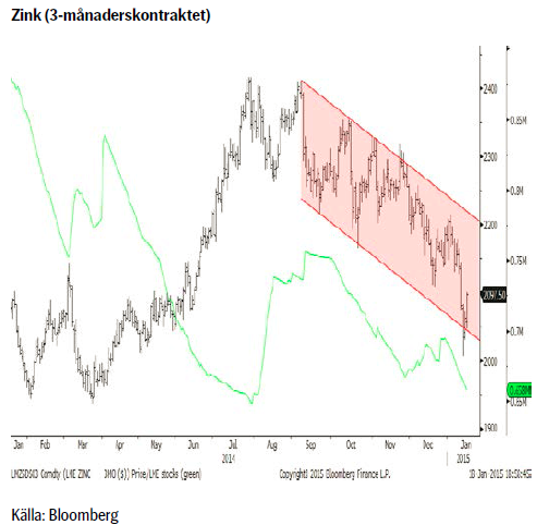 Zink höll ställningarna väl i den generella svagheten bland basmetallerna i början av året. Den förväntade förbättringen av den fundamentala balansen är fortfarande relevant och förhindrar större rörelser på nedsidan. Stängningen av den gigantiska Centurygruvan i Australien senare i år tycks vara en stödjande faktor. Under senare delen av december och i viss utsträckning även i början av detta år har vi sett köpare som drar nytta av den låga terminspremien. Kurvan är i contango ända till december 2016. Därefter vänder den till backwardation. Det kan vara så att marknaden ser en potentiell korthet på grund av de förväntade utbudsrestriktionerna senare i år och I början av 2016.