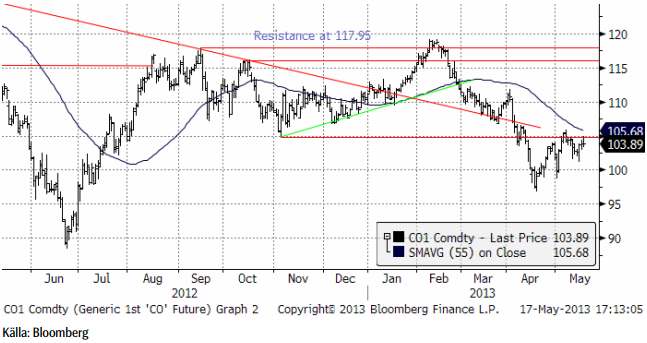Oljan var upp vid tidigare stödet (nu motståndet) vid 105 dollar. Priset orkade inte igenom och då brukar prisfall följa. Stöd finns vid 100 dollar, men trenden är nedåtriktad i det korta perspektivet. I det långa perspektivet saknas trend för råoljan.
