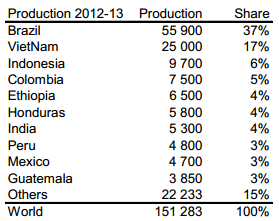 Brasilien är världens största producent av kaffe och har hållit den positionen de senaste 53 åren. Under militärdiktaturens tidsjönk landets andel från 50% ner till 20%, men den hämtade sig stadigt från mitten av 1990-talet och har legat stabilt de senaste 13 åren. Vietnam producerar uteslutande den sämre kaffesorten robusta. Den odlas också i delstaten Espirito-Santo i nordöstra Brasilien. Just den delen av Brasilien har varit ovanligt torrt, vilket kan ge lite mindre skörd av robusta.