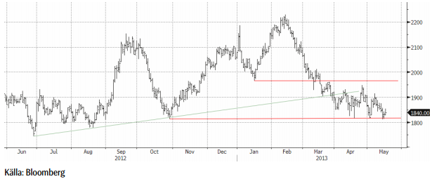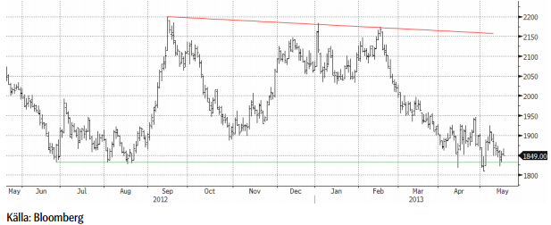 Priset har nu ”testat” stödnivåerna vid $1810-20 vid tre tillfällen, och lyckats studsa upp. Det är ett styrketecken. Vi ser fysiska aktörer som går in och täcker in framtida konsumtion via terminsköp vid varje dipp. Tekniskt orienterade fonder säljer vid varje uppställ. Trenden blir därefter, det rör sig sidledes. Vi ser tecken på att marknaden håller på att bottna ur. Högkostnadsproducenterna, framför allt i Kina, förväntas minska utbudet (ännu mer) om priset långvarigt stannar på nuvarande nivåer.