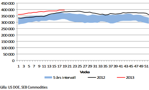 Nedan ser vi amerikanska råoljelager enligt DOE i tusen fat. Den svarta kurvan är 2012 års lagernivåer vecka för vecka och den lilla röda linjen är 2013 års nivå.