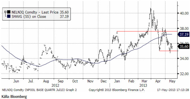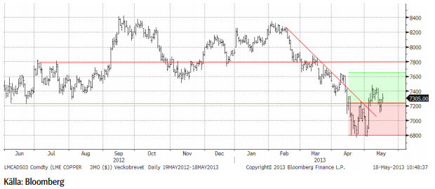 Den internationella konjunkturen står och tvekar, och så även de industriella råvarorna. Råvarumarknaderna har under våren präglats av frågetecken kring Kina, där ekonomin inte riktigt tar den fart som väntats under de säsongsmässigt starka 2:a kvartalet. Den andra stora råvarukonsumenten, USA visar positiva tecken, men även där har tveksamhet kring konjunkturen smugit sig på marknaden. Veckans statistikskörd spädde på osäkerheten: 1. antalet personer med arbetslöshetsunderstöd steg rejält, 2. husmarknaden var svagare än väntat, 3. inflationstrycket (KPI) är svagt och 4. industriaktiviteten tvekar (Philly Fed). Samtidigt har marknaden svårt för fotnedsättning: ska Fed påbörja exitpolitiken under hösten och fasa ut värdepappersköpen på $ 85 mdr/mån? Flera Fedtal tolkas som att exitplaner övervägs – vilket ger dollarstöd, en faktor som verkar hämmande på de dollarnoterade råvarorna. Våra makroekonomer räknar dock med att Fed fortsätter året ut.