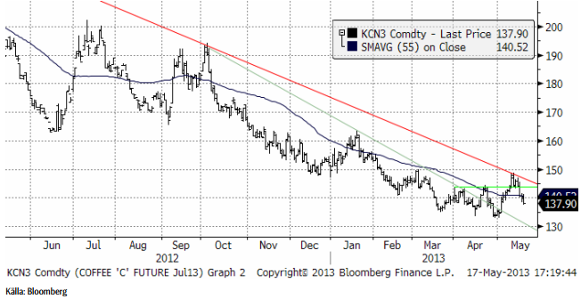 Vi tror man kan försöka sig på att köpa kaffe för lite längre sikt, t ex KAFFE S. En stopp-loss på 132 (basis juli-kontraktet) bör man dock ha.