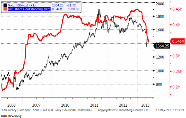 April månads fyndköpare av mynt som gjorde att the US Mint, med flera nådde försäljningsrekord, har tömt ut sina resurser. Maj ser ut att endast nå 65% av april månads försäljning enligt the US Mint. Samtidigt fortsätter ETP-innehavare dumpa sina innehav. Nedan ser vi guldpriset och antal utestående GLD-depåbevis (röd kurva).