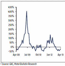 Ett annat tecken är förändringen av LME-lagret. Vi ser både lagerminskningar och en ökning av ”cancelled warrants”. Det senare är statistik på mängden material som är på väg att plockas ur lager. Uttagen sker i Sydkorea och tyder på ökad efterfrågan – sannolikt med destination Kina. Detta stämmer överens med den förväntade ökningen av importen till Kina. Kineserna brukar utnyttja prisskillnaden mellan LME och Shanghai, som nu efter prisnedgången är till LME:s fördel.