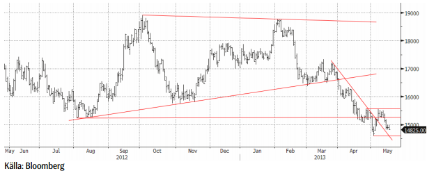 Effekten av RKEF-tekniken riskerar att flytta ner nivån där utbudsminskningarna verkligen får effekt. Priset har brutit viktiga stödnivåer, och vi får gå tillbaka till juli 2009 för att hitta lägre priser. I det perspektivet kommer nästa stora stödnivå in kring $14000. Vi är inte så långt därifrån och vi bedömer nivåerna från dagens pris kring $14800 ned mot nivån som väldigt attraktiva på 6-12 månaders sikt. I det perspektivet är Nickel S (utan hävstång) att föredra.