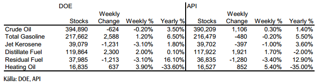 Lagren och lagerförändringarna i USA den senaste rapportveckan (som slutade den 10 maj) ser vi nedan, enligt Department of Energy och American Petroleum Institute.