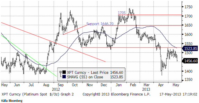 Platinapriset föll i fredags ner till den övre delen av konsolideringen efter prisfallet i april, till 1450. Det är en nivå där det kan finnas tillräckligt stöd för att hejda prisfallet, men dynamiken är ändå på nedsidan.