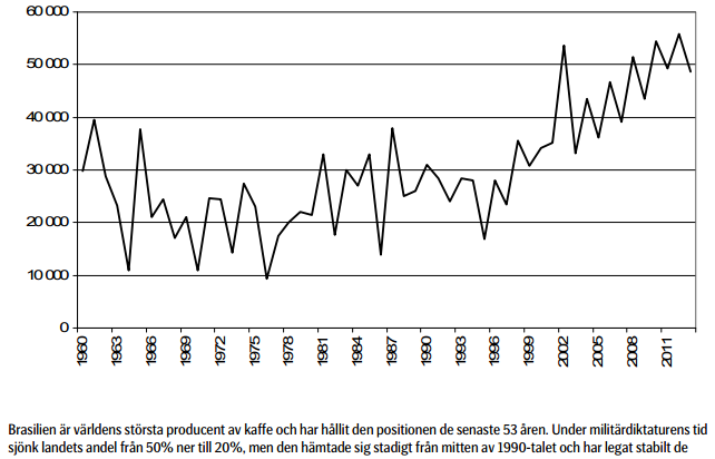 Nedan ser vi Brasiliens produktion i 1000 säckar. Den sista noteringen, för 2013/14, är hämtad från Conabs prognos. Resten är USDA:s data.