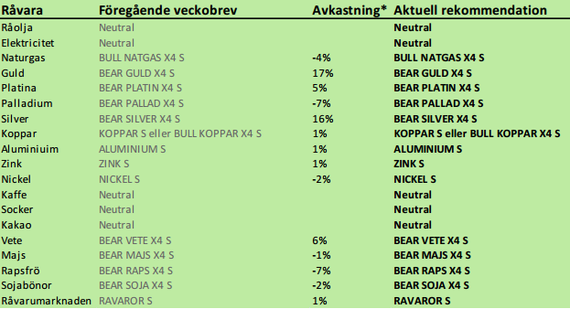 *) Avkastningen avser 1:1 råvarucertifikat där de ingår i rekommendationen. I den aktuella tabellen ovan har jag tagit prisförändringen den senaste veckan sedan det förra veckobrevet publicerades.