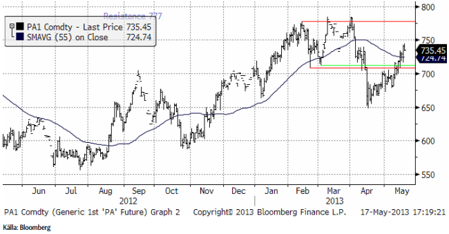 Palladium fortsätter att sega sig upp från förra veckans 710 dollar till 735 dollar. 750 dollar är en nivå där många nog tycker att det är allt för frestande för att inte sälja.