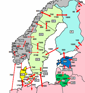 Överföringskapacitet till utanför elbörsområdet ser vi i kartan nedan. Siffrorna anger överföringskapaciteten i MW.