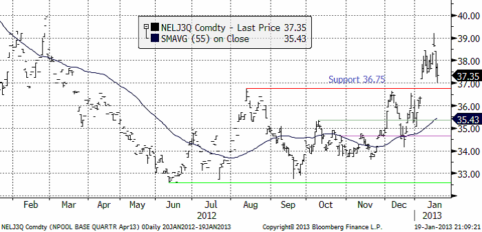 Elpriset, för det andra kvartalet, reagerade något ologiskt på kyla just nu i Norden och gick upp och noterade det högsta priset på ett år. Det är påverkan på den hydrologiska balansen som dragit upp priset. Euforin blev dock kortvarig och rörelsen på dagen liknar en ”key reversal day”. En sådan signalerar trendvändning. Nedåt i det här fallet. Stöd finns nu på 36.75 och så som priset faller nu kan den stödnivån mycket väl komma att brytas.