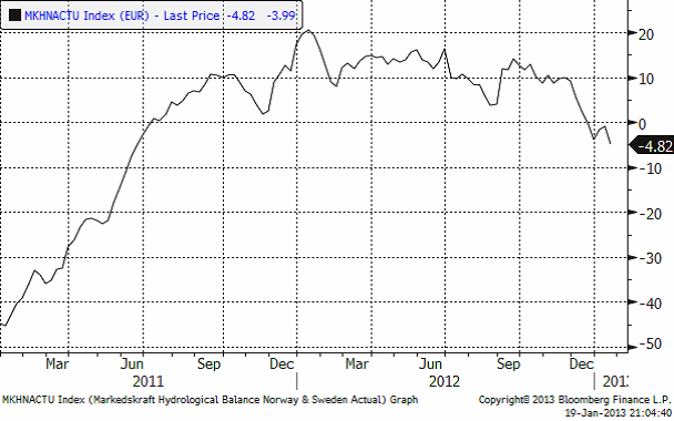 Den hydrogiska balansen har dock fortsatt att falla. Markedskraft publicerar statistik på den hydrologiska balansen för Norge och Sverige. Den anges i TWh kraft som finns lagrat i vatten som kan passera ett vattenkraftverk. I diagrammet nedan visas hur mycket mer / mindre som finns i förhållande till vad som är normalt. Och med normalt avses genomsnittet för respektive dag på året mellan 1962 och 2006. Sedan förra veckan har underskottet ökat med 4 TWh till -5TWh.